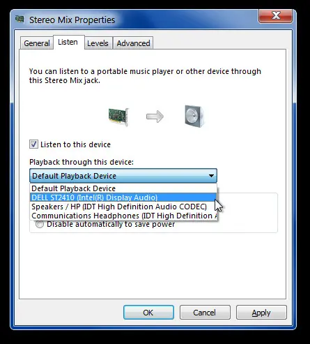 Haga doble clic en el nuevo dispositivo o seleccione Propiedades en el menú contextual del botón derecho y la ficha Escuchar. Marca la opción Escuche esta opción de dispositivo y seleccione su dispositivo HDMI desde el menú desplegable. Haga clic en Aplicar, Aceptar para que los cambios surtan efecto