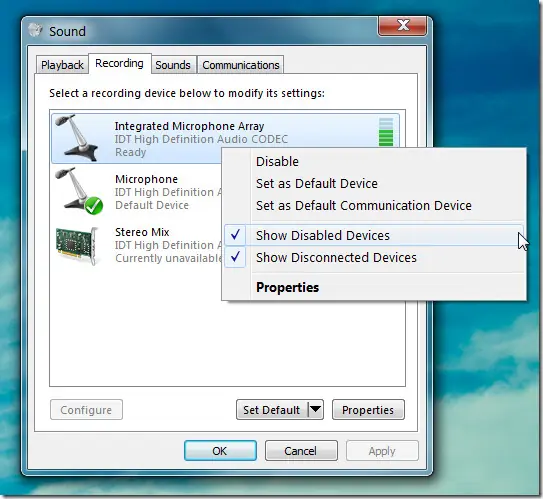 Una vez hecho esto, dirígete a la pestaña de grabación y seleccione Mostrar dispositivos deshabilitados desde el menú contextual del botón derecho. Esto mostrará otro dispositivo de grabación que se llama Mezcla Mono o Stereo Mix. Haga clic derecho en el nuevo dispositivo este nuevo dispositivo y haga clic en Activar. A continuación, lo establece como el dispositivo predeterminado, seleccionándolo y haciendo clic en el botón Predeterminar.