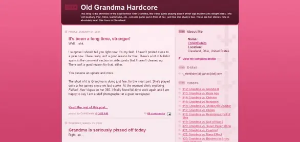 Muchos conocen a la abuela hardcore gamer, pero pocos saben que tiene su blog en donde escribe y sube videos de sus partidas. La vieja putea, bardea y comenta sobre los juegos hardcore que juega.