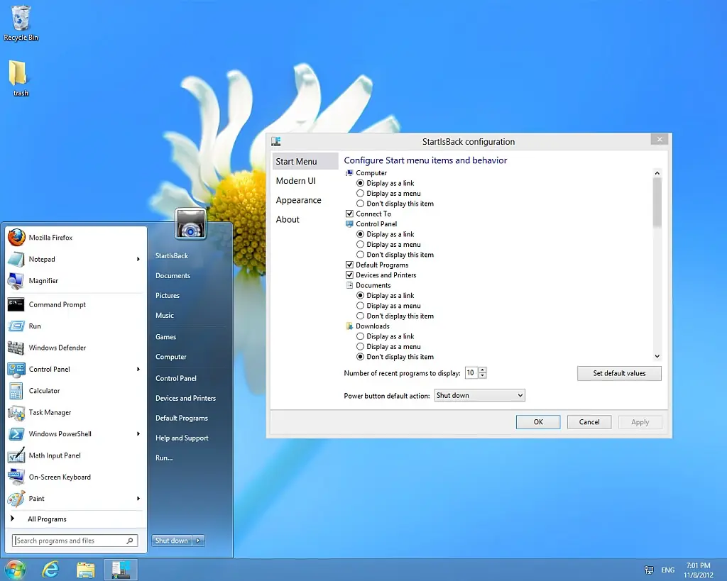 Quizás la mejor opción para integrar el botón de inicio en Windows 8. Este programa permite configurar con los accesos más habituales de otros sistemas operativos. Así, podemos tener acceso a “Mis documentos”, “Mis imágenes” ….
