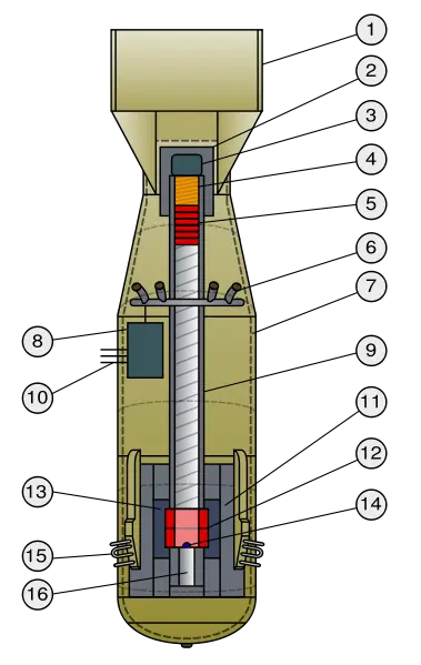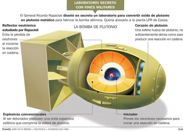Esta imagen se trata del modelo de bomba arrojado sobre Nagasaki, la cual funcionaba por la fision del plutonio, inducida por explosivos.