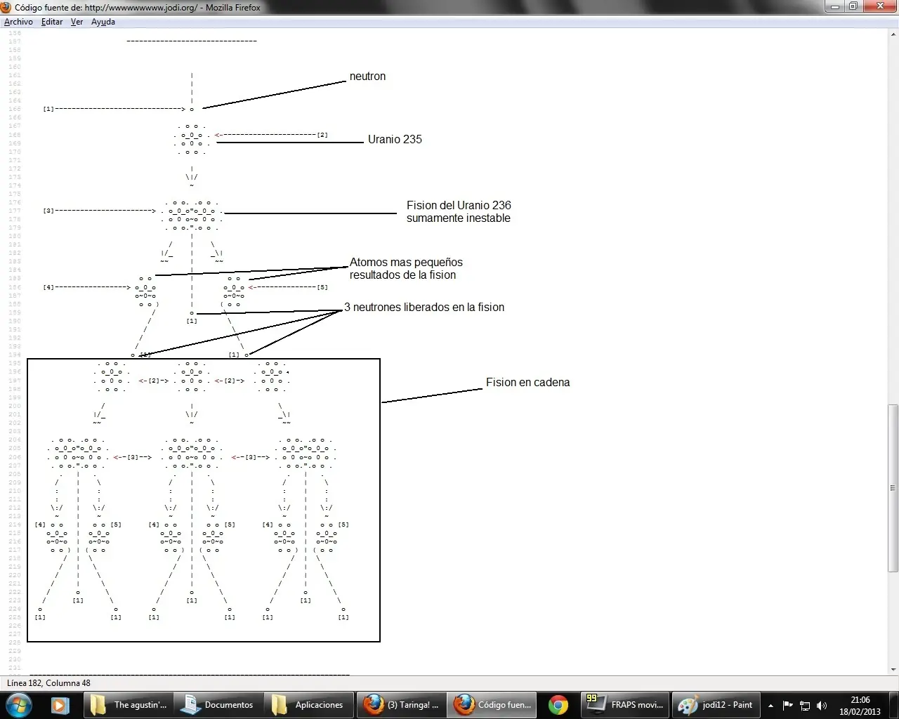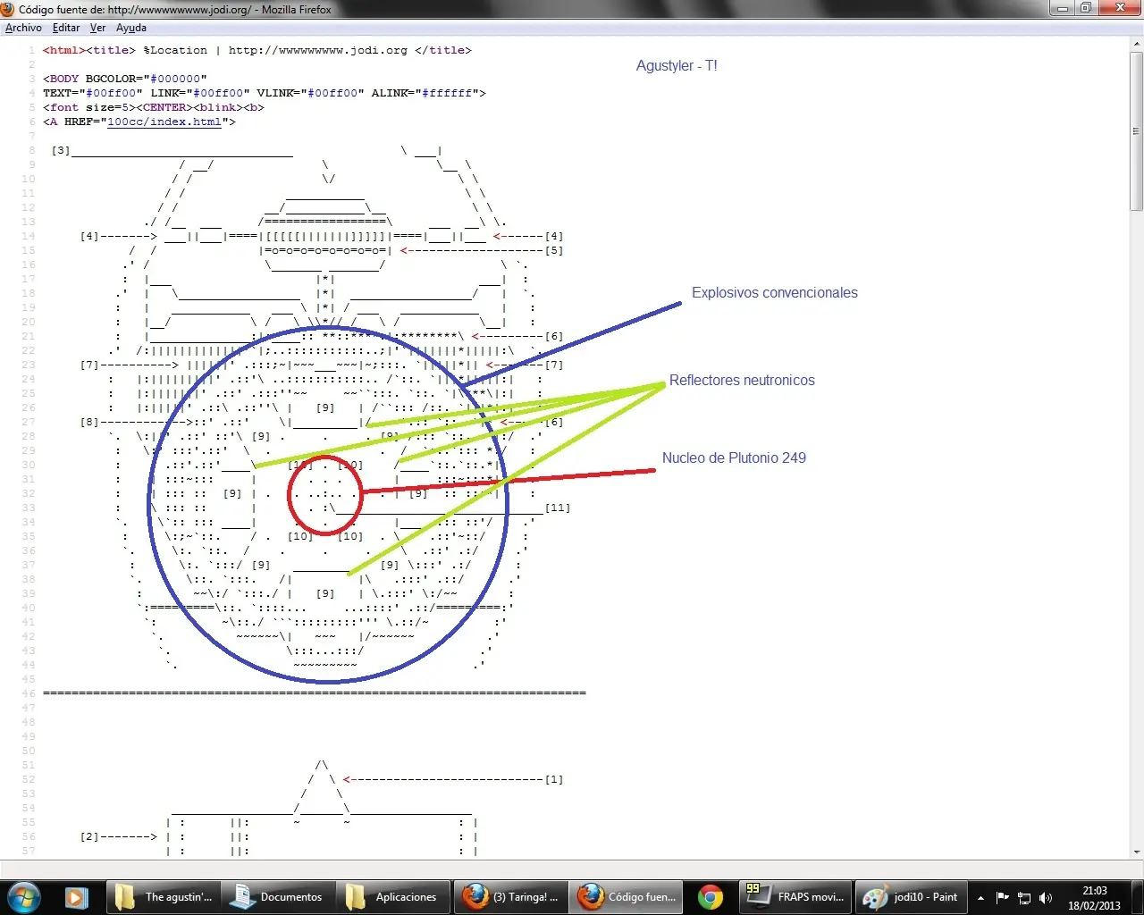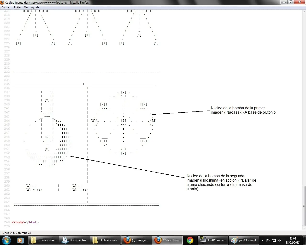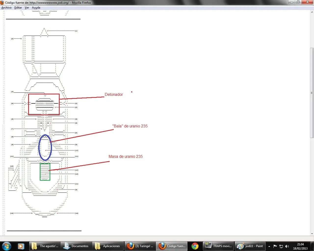Eso era el codigo fuente de la primer pagina. Basta pensarlo unos minutos para alguien que sabe del tema, para reconocer que eran esos diseños. Eran diseños de bombas. Y no de cualquier bomba, de bombas nucleares, precisamente las que explotaron en Hiroshima y Nagasaki. Los circulos que se partian en la tercer imagen, era la reaccion en cadena de la fision nuclear del Uranio -235 el cual se uso en la primer bomba. Y en la cuarta que era menos evidente, dedujimos, que se trataba del modo en que funcionaba.