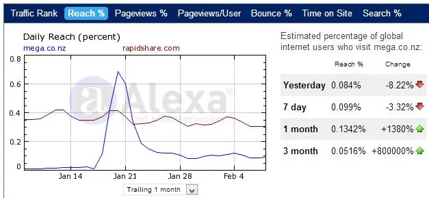 El tráfico del nuevo servicio de almacenamiento MEGA, ha caído un 70 por ciento desde el pico máximo obtenido en el lanzamiento, según las cifras del servicio de medición Alexa.