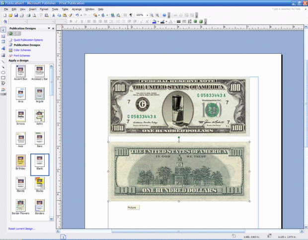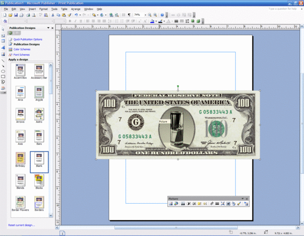 Ahora es el momento de imprimir su composición. Me gusta usar Microsoft Publisher, pero usted puede usar lo que quieras.Así que abra su editor de Microsoft y te arrastre billete de un dólar en el mismo.Ahora, alinearla con la parte superior izquierda líneas azules.Aumentar el zoom al 100% y que la imagen del tamaño de un billete ordinario.Luego de impresión.