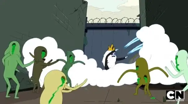 La primera mención de la guerra en la serie fue en el episodio "Los Cineastas", cuando Finn y Jake descubren las advertencias que han quedado atrás en el tiempo (y que las películas compradas para uso doméstico de vídeo en general, están protegidas para ser utilizadas en el uso exclusivo y no para uso público), así que Finn y Jake deciden seguir lo que dice la advertencia para no romper la ley.