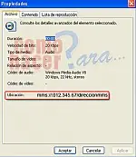 También podemos escuchar cualquier radio online por Winamp sin necesidad de que se encuentre en los servidores de SHOUTcast. Para ello vamos a la emisora que queremos oír y buscamos la dirección mms, que es el protocolo de transferencia multimedia con la que se transmiten las radios por Internet. Por ejemplo, si la emisora se escucha mediante Windows Media, la abrimos para escuchar mediante ese reproductor y hacemos clic con el botón derecho sobre la ventana del Windows Media. En propiedades nos mostrará la dirección mms con la que se está transmitiendo. (ver imagen 2)