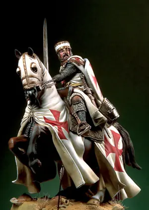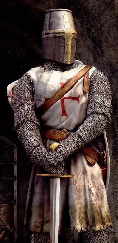 Caballeros Templarios exhibiendo la vestimenta típica: Cota de Malla, escudo, espada, casco y manta blanca con la cruz de malta