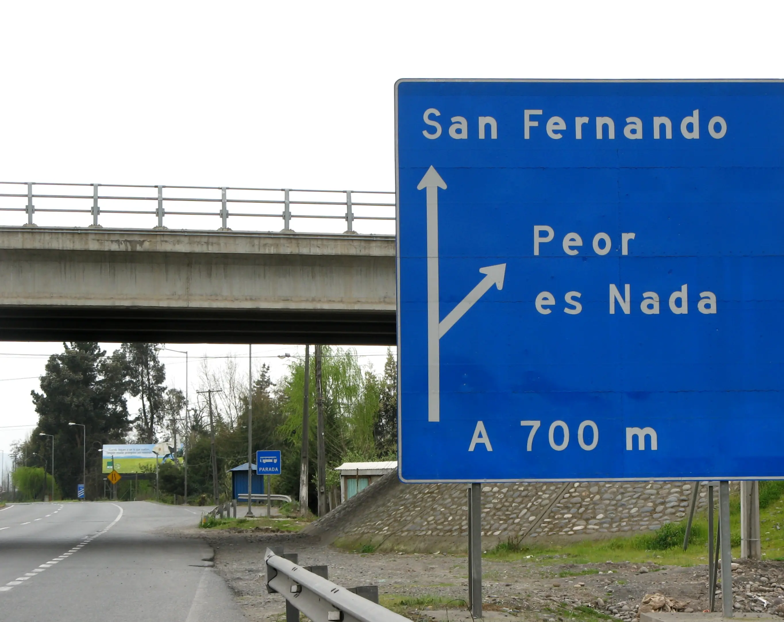 Peor es nada: Ubicado en la comuna de Chimbarongo, Sexta Región, este poblado es emblema de la "ruta freak" de Chile. Según explica Jorge Fuentes, profesor de la escuela local y autor de un libro con la historia del pueblo, su nombre data del siglo XIX, cuando un rico hacendado repartió sus tierras entre sus hijos, heredando el terreno más pequeño a la única mujer. Al oír el testamento, y como no era lo que esperaba, ella pronunció la famosa frase... "Peor es nada", que fue reproducida por los lugareños hasta que el sector fue llamado así. Gentilicio: Peoresnadino.