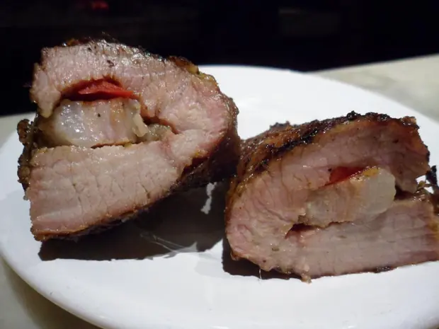 Receta: 900 gr de carne de ternero mamón (lomito, cuarto trasero y delantero o espinazo); 200 gr de tocino; tela (tejido que envuelve el estómago) de cerdo o cordero, cantidad necesaria: sal, orégano, ajo, ají y pimienta negra, molidos finamente. Opcional: morrones rojos, queso fresco, aceitunas y ciruelas pasas para mechar.
