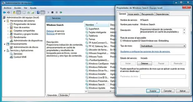 Afortunadamente, es posible detener el servicio de indización cuando lo deseemos si preferimos ahorrar los recursos de CPU y memoria que acapara. Solo tenemos que pulsar el botón derecho del ratón sobre Equipo y acceder a Administrar. En la barra de la izquierda, seleccionamos Servicios y Aplicaciones/Servicios y buscamos el campo Windows Search. Tras hacer doble clic sobre él, en la pestaña General marcaremos Tipo de inicio como Deshabilitado. Tras aplicar y aceptar los cambios, quedará detenido y podremos volver a activarlo sin problemas en cualquier momento si lo deseamos.