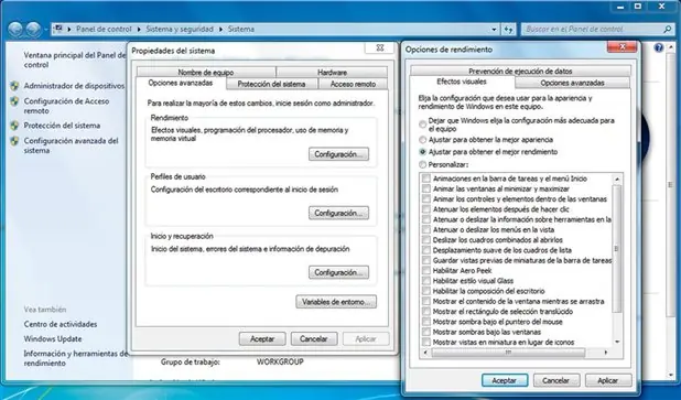 Por una parte, podemos desactivar los temas de Aero haciendo clic con el botón derecho en un área vacía del escritorio y entrando en Personalizar. En Cambiar los efectos visuales y los sonidos del equipo, basta con escoger cualquiera de los temas Windows 7 Basic o Windows Clásico. Por otra parte, también podemos prescindir de los efectos visuales para dotar a nuestro ordenador de mayor fluidez. En Equipo, pulsamos con el botón derecho del ratón, entramos en Propiedades y seleccionamos Configuración avanzada del sistema. En Opciones avanzadas/Rendimiento/Configuración, nos situamos en la pestaña Efectos visuales y marcamos Ajustar para obtener el mejor rendimiento. Así, nos libraremos de sombras y animaciones, entre otras características.