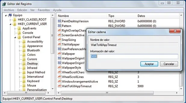 Desde el Registro podemos modificar este plazo de tiempo e indicar que, en caso de demora, se detenga todo automáticamente y se apague o reinicie el sistema, aunque corremos el riesgo de perder información si no hemos guardado los documentos que tuviésemos abiertos. En concreto, crearemos dentro de la rama HKEY_CURRENT_USERControl PanelDesktop una entrada de tipo Valor de cadena (desde la barra de menú Edición/Nuevo ) con el nombre WaitToKillAppTimeout. Hacemos clic derecho sobre ella y, en Información del valor , introduciremos una cifra en milisegundos, con lo que si, por ejemplo, solo queremos esperar un máximo de 5 segundos, escribiremos 5.000.