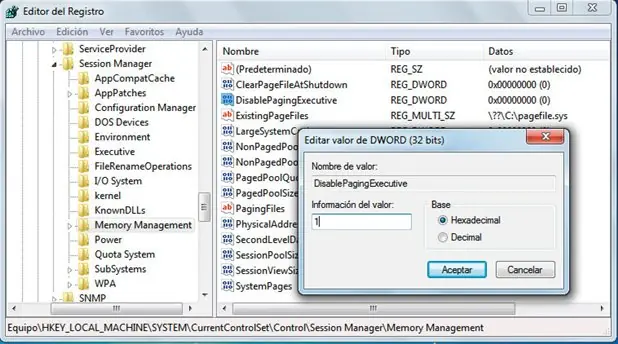 Para cambiar este parámetro nos dirigimos al Registro y buscamos la entrada HKEY_LOCAL_MACHINESYSTEMCurrentControlSetControlSession ManagerMemory Management. Ahí, hacemos doble clic sobre DisablePagingExecutive y cambiaremos la Información del valor de 0 a 1. Tras reiniciar el sistema, los cambios quedarán aplicados y habremos optimizado el fichero de paginación.
