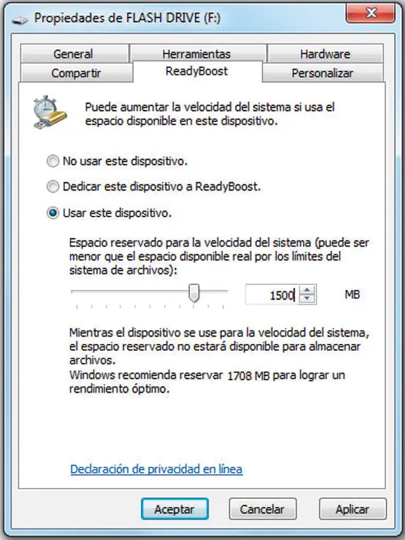 En Espacio reservado para la velocidad del sistema es recomendable marcar al menos 1 Gbyte para beneficiarnos de todas las bondades de esta tecnología (teniendo en cuenta, eso sí, que tal espacio quedará bloqueado y no estará disponible para el almacenamiento de archivos al uso). De todas formas, el propio Windows nos indicará el mínimo de cantidad que mejor se ajustará a nuestras necesidades (en el ejemplo de la ilustración, se nos aconseja reservar 1.708 Mbytes).