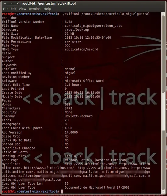 Los metadatos no solo se guardan en fotografias, se pueden analizar archivos de extensión .doc .ppt .pps .xls .docx .pptx .ppsx .xlsx .sxw .sxc .sxi .odt .ods .odg .odp .pdf .wpd .svg .svgz .swf, y más. Haré un ejemplo con un archivo que tengo en mi máquina.