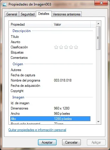 Primero localiza el archivo que quieres eliminar los metadatos. Luego botón derecho y escoges la opción Propiedades, cargará una ventana y vas a la pestaña Detalles. Verás los datos que tiene el archivo.