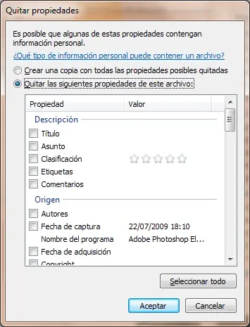 Paso siguiente será dar clic en el enlace Quitar propiedades e información personal. Ahora marca la opción Quitar las siguientes propiedades de este archivo. Luego podrá seleccionar qué datos del archivo quiere eliminar o simplemente dando a Seleccionar todo. Finalmente clic en Aceptar para cerrar la ventana.