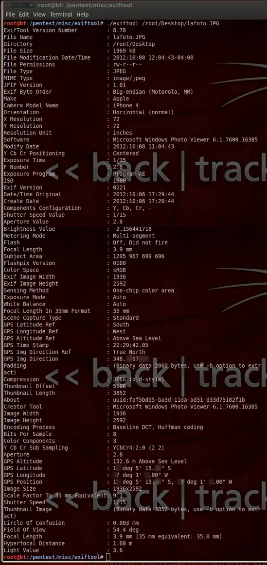 Pero empecemos por los datos menos privados. La foto de Jita fue tomada el 6 de octubre de 2012 a las 17:29, con un iPhone 4 que cuenta con el formato Big-endian (Motorola, MM). Pero lo más importante es que nos brinda las coordenadas de su GPS: 1# deg 5' 15.##" S, #7 deg 1' #.00" W. Con ese dato a buscarlo por Google maps.