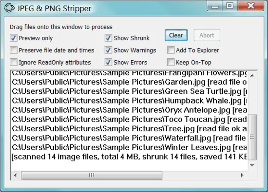Solo tendrás que arrastrar la carpeta o imágenes hacia el programa para luego de un análisis y eliminar los metadatos de la imagen.
