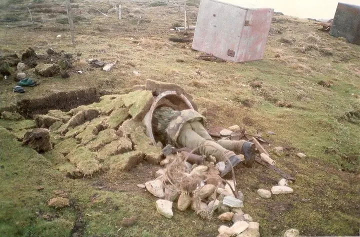 Foto: Un ingeniero británico trata de desacticas una "trampa cazabobos argentina" el arma esta unida por cables muy sencibles al viento. Guerra de Malvinas