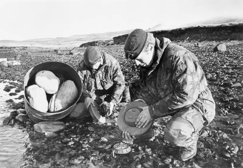 Foto: Ingenieros reales tratan de desactivar unas de las tantas minas antitanque argentinas, además potenciadas por un tanque de 200 litros lleno de rocas para que sirvieran como terrible metralla.Guerra de Malvinas 1982.