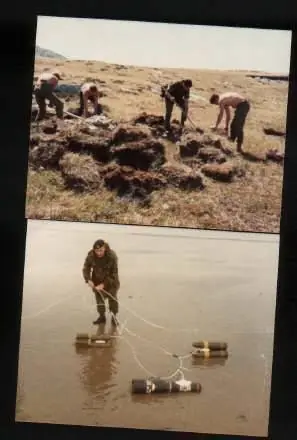 Foto: Luego de la guerra, un ingeniero inglés desarma con extremo cuidado una mina argentina de origen español, la cual estaba oculta debajo de la turba.