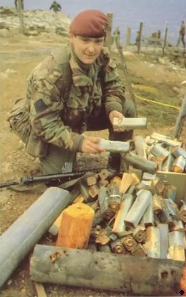 Foto: Un paracaidista británico muestra tubos de 10Kg del Explosivo argentino Trotyl, Guerra de Malvinas 1982.