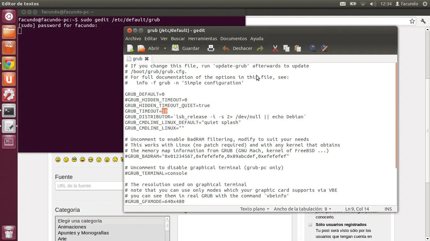 pero eso no acaba ahí... si ahora seleccionan ubuntu les saldrá el grub y tendrán que volver a seleccionar os (o esperar a que pasen 10s). para solucionarlo iniciamos ubuntu. abrimos una terminal. en la terminal metemos: