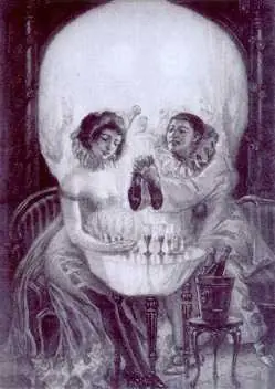¿Puedes ver la calavera en primer plano? ¿y la escena romántica? Mira con atención, pues en el centro de la imagen hay una pareja de enamorados declarándose. Este efecto de doble imagen es a menudo utilizado por pintores y dibujantes.