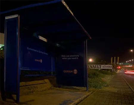 Campaña realizada en Sudafrica, por Osram para sensibilizar en el ahorro energético. En el anuncio se puede leer “Utiliza solamente la electricidad que necesites” y solo se encendía al sentarte sobre el.