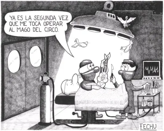 El electricista va a la sala de Unidad de Tratamientos Intensivos de un hospital, mira a los pacientes conectados a diversos tipos de aparatos y les dice: