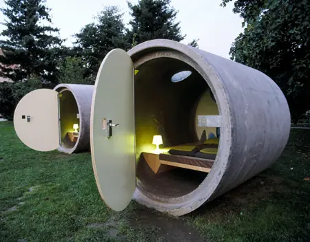 El Das Park Hotel Ottensheim, (Austria), obra del artista Andres Strauss, se compone de una sucesión de gigantescos tubos de hormigón, de un peso de 9,5 toneladas cada uno, situados sobre una verde pradera. Cada uno, instalados de forma individual, ofrece las comodidades de una austera habitación de hotel