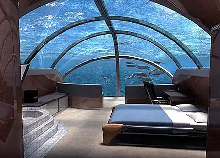 'Poseidon' es un hotel de 5 estrellas situado en las Bahamas y que está bajo el fondo del mar. Las paredes de las habitaciones son transparentes para poder observar de la mejor forma el mundo submarino. Desde ella además puedes controlar la iluminación y lanzar al agua comida para los peces.