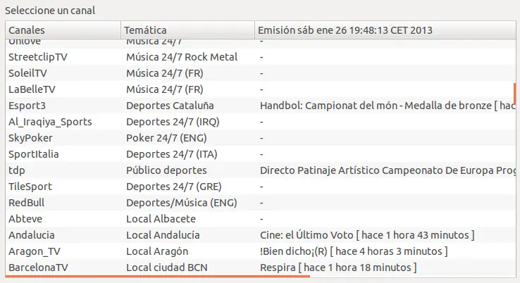 Sencillo script en bash para ver y grabar televisión en sistemas GNU/Linux / BSD sin tarjeta capturadora / sintonizadora. Solo se necesita una conexión a Internet, tener instalado Mplayer, Curl, Rtmpdump y Zenity para entornos Gtk o Kdialog para el escritorio KDE. Actualmente se puede disfrutar de casi 200 canales en español, conectando a cadenas de televisión de España, Perú, Chile, Cuba, Venezuela, Bolivia, Argentina, Colombia, Paraguay y Ecuador. También hay algún canal en Inglés (Noticias y divulgación científica) y otros de temática infantil en diferentes idiomas.