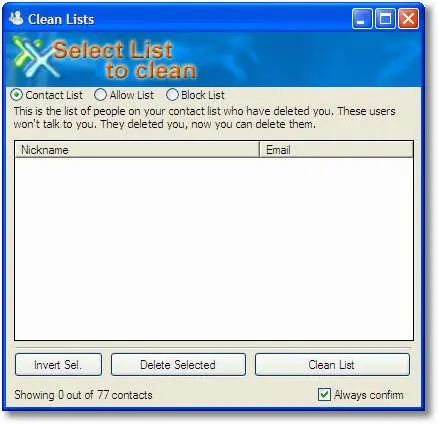 2. Puedo saber quién me borró de su lista de contactos?: Sí. La forma difícil y sin nada extra para averiguarlo es ir a Herramientas/Opciones/Privacidad en Messenger y hacer click en el botón Ver…, y así veremos a quienes sí nos tienen agregados, de manera que quienes no figuren, no nos tienen. También algunos clientes alternativos que se conectan a la red de MSN lo informan directamente sobre los datos de cada contacto, como aMSN o Gaim; sino otra opción es utilizar Noroom’s ListManager, una herramienta freeware que además nos permite de la forma más intuitiva y efectiva “limpiar” nuestra lista de contactos de aquellos que nos quitaron, así como también borrar permisos (allows) y bloqueos dados a contactos que ya no tenemos. De esta forma se reduce la cantidad de información que se intercambia al iniciar sesión, agilizándose esta.