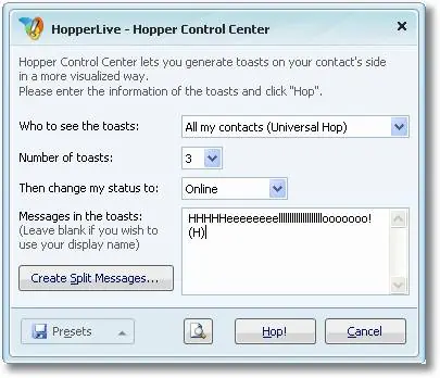* HopperLive es otro script cuya función es mandar ventanas de aviso de MSN a los demás usuarios de nuestra lista con el texto que se nos ocurra, sólo para molestar, vió?