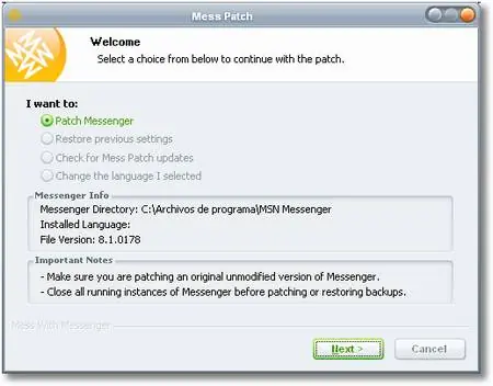 6. Se puede tener el cliente de MSN Mesenger sin publicidad en las ventanas?: Sí. En el sitio Mess.be puede descargarse el Mess Patch, el cual permite realizarle decenas de modificaciones al cliente MSN de Microsoft, entre ellas eliminar la publicidad, y también los botones y barras de búsqueda. El programa es gratuito y en el sitio van lanzando uno por cada revisión de Messenger que aparece.