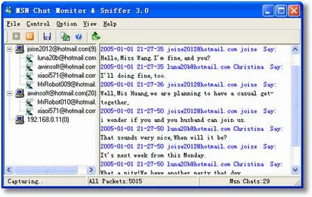 3. Alguien puede leer lo que escribo por MSN?: La respuesta es sí. Haciendo a un lado la posibilidad de tener un troyano o keylogger que capture todo lo que se teclea, los mensajes que se envían por la red pueden ser interceptados y almacenados. Esto se debe básicamente a que los mensajes viajan como texto plano, sin ningún tipo de cifrado. De esta manera, alquien que conversa por MSN desde su notebook usando una conexión Wi-Fi puede tener todas sus charlas vistas y guardadas por cualquiera que esté en el mismo café y tenga el software adecuado (que no es difícil de conseguir). También está el caso del empleado que chatea desde la computadora de su oficina, donde también es perfectamente posible que el administrador de la red intercepte y almacene todas las charlas de MSN y otros mensajeros que ocurren a través de equipos de la compañía. Esto muchas empresas lo hacen por políticas de seguridad, y sin informar a sus empleados, para poder detectar fugas de información confidencial de la empresa o tener una constancia de todo lo que cualquier empleado de la firma haya dicho, para preveer conflictos futuros. Msn Chat Monitor & Sniffer es una de estas aplicaciones que permiten espiar y almacenar todo lo que se conversa en una red a través de MSN.