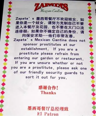 “La Cantina Mexicana Zapata’s no patrocina prostitutas en nuestro establecimiento. Si tu eres una prostituta por favor no entres a nuestro jardin o restaurante. Si tu no estas segura de ser o no una prostituta, por favor preguntale a nuestros amigables guardias de seguridad y ellos te diran si eres prostituta o no.”