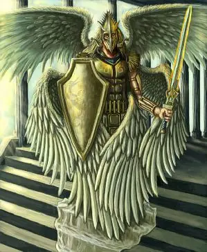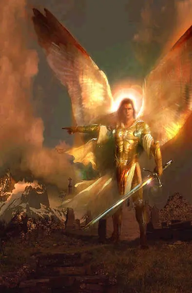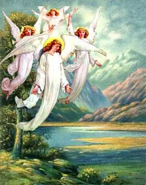 Por último, los ángeles son los que complementan el conjunto jerárquico. Ellos constituyen el grado inferior pues son los que están más cerca de los hombres y del mundo, son los que se nos manifiestan. Se representan también como simples soldados, vistiendo ligeras túnicas y pueden llevar, velas o palmas de triunfo.