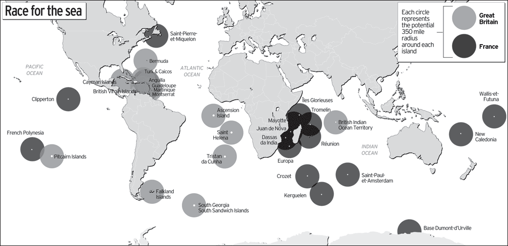 Y esta otra imagen, nos muestra en color gris claro, las presentaciones que hará Gran Bretaña alrededor del mundo, afianzando así, el control total de los mares. En el mapa no se muestra la totalidad de las pequeñas islas que están en poder británico, pero es suficiente para tener una idea de lo que está en juego. En color oscuro se muestra los potenciales reclamos franceses.