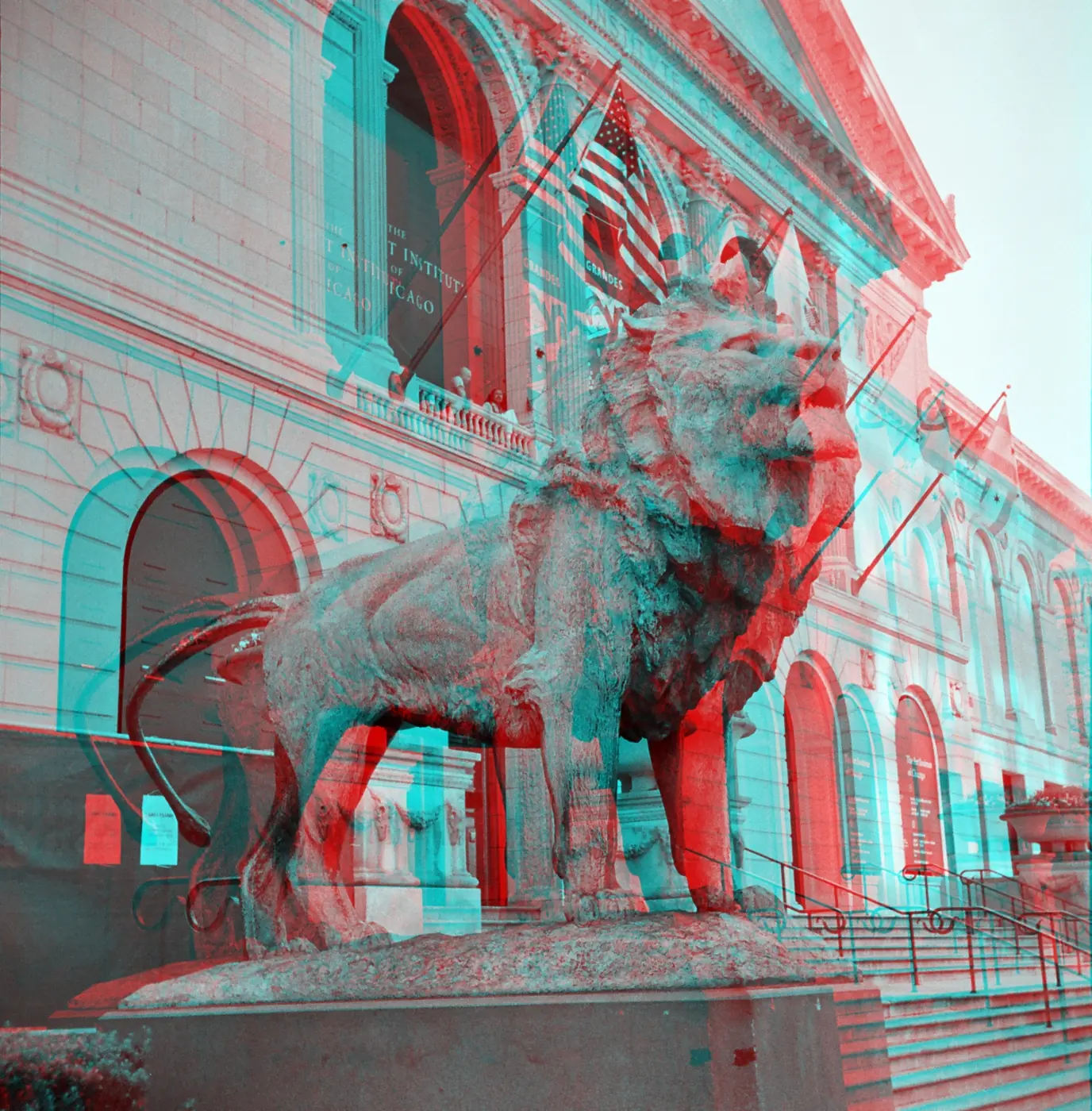 Ver anaglifos a través de filtros de color apropiados da como resultado que cada ojo observa una imagen levemente diferente. En un anaglifo rojo-azul por