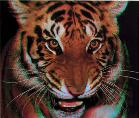 ejemplo, el ojo cubierto por el filtro rojo ve las partes rojas de la imagen como "blancas" y las partes azules como "oscuras" (el cerebro produce la