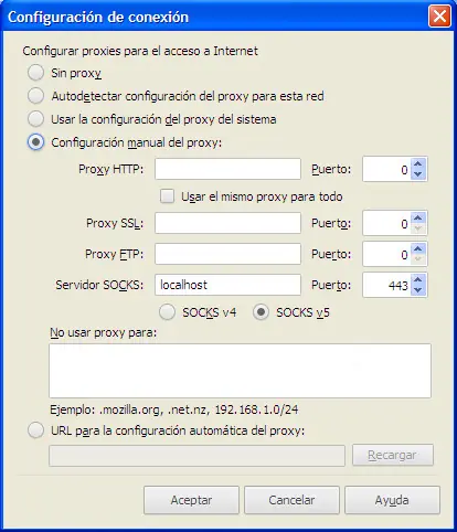 7.- Finalmente, sin cerrar PuTTY, abrí y configurá Firefox (o tu explorador favorito) para que se conecte a Internet a través de PuTTY.