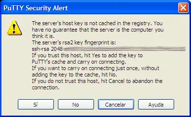 5.- Volvé a la pantalla principal de PuTTY, hacé clic en Save y luego en Open. La primera vez que te conectes al servidor va a salir un mensaje de alerta como el que aparece a continuación: