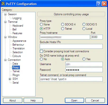 3.- En caso de que el "cliente" se encuentre detrás de un proxy, no te olvides de configurarlo correctamente. En caso de que no sepas bien qué datos ingresar, abrí Internet Explorer e ingresá a Herramientas > Conexiones > Configuración de LAN > Avanzadas. Copiá y pegá los datos que aparecen ahí en PuTTY, como se ve en la imagen que aparece a continuación. En algunos casos, es posible que tengas que ingresar un nombre de usuario y contraseña.