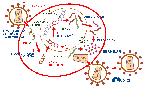 Normalmente, los glóbulos blancos y anticuerpos atacan y destruyen a cualquier organismo extraño que entra al cuerpo humano. Esta respuesta es coordinada por un tipo de células llamados linfocitos CD4. Desafortunadamente, el VIH ataca específicamente a las células que expresan el receptor CD4, una de las más importantes son los linfocitos T CD4+ y entra en ellos. Una vez dentro, el virus transforma su material genético de cadena simple (ARN) a uno de cadena doble (ADN) para incorporarlo al material genético propio del huésped (persona infectada) y lo utiliza para replicarse o hacer copias de sí mismo. Cuando las nuevas copias del virus salen de las células a la sangre, buscan a otras células para atacar. Mientras, las células de donde salieron mueren. Este ciclo se repite una y otra vez.