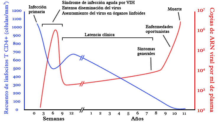 Curso típico de la infección por VIH. Los detalles, en particular los plazos, varían ampliamente de un infectado a otro. En azul, evolución del recuento de linfocitos T CD4+. En rojo, evolución de la carga viral.