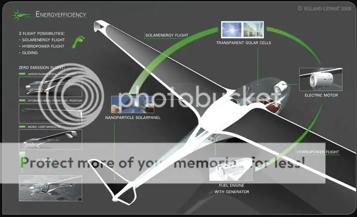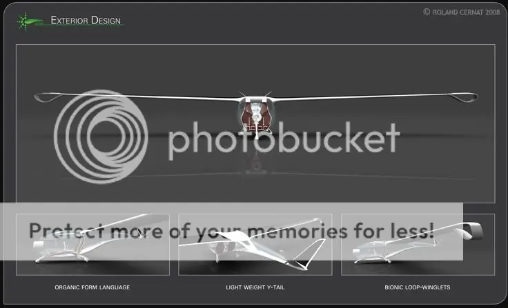 Este diseño de planeador creado por Roland Cernat, obtuvo el primer premio en la competencia Lucky Strike Junior Designer; pretende ser el avión ecológico perfecto.