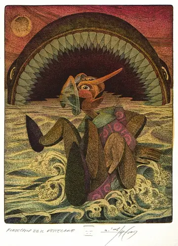 "Cuando Pinocho estuvo frente a la ballena le pidió que le devolviese a su papá, pero la enorme ballena abrió muy grande la boca y se lo tragó también a él."
